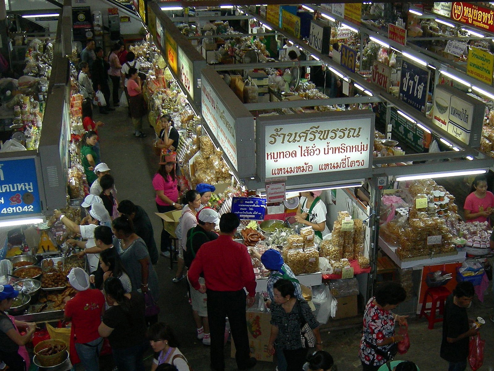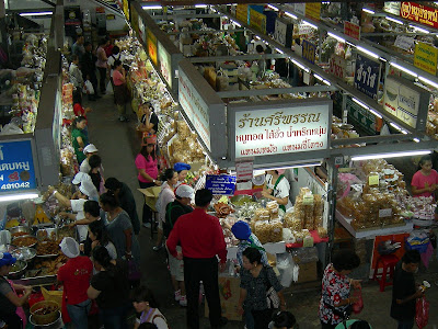 At the stalls on the left is hot foods - sausages, green things and round things (don't know what they are), across the aisle to the right we have cooked foods then gradually an assortment of packaged foods. During our travails, Pang took me to a stall and showed me this funny looking dark brown stuff - it was dry and shrivelled. He said try some of this, it's roast beef. It was the strangest stuff I'd ever seen but it did indeed taste lie roast beef. It will keep he said for a long time. I bought a piece and had it with bread and tomatoes for lunch and finished the last of it in Laos.
